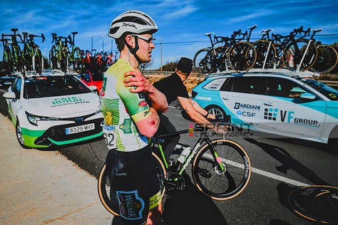 Even with those parameters in front of me, I believed I needed to change my body (I won’t share where those beliefs came from). From all angles, even before I joined the pro team, I was being told I was too big and wouldn’t stand a chance. That was the opinion which extended across several potential teams—without any evidence base. And so, I did change my body, blinded by what I thought being a pro-cyclist should mean. I put it down to just being one of those things I’d have to live with; I might as well learn to deal with it whilst I’m in the continental team, where I’ve got a chance to adapt and learn. My heavy crash at the Paris Roubaix Espoirs handed me a crux point to be able to begin that process of moulding myself into this image several months later, that of being ‘sharp.’